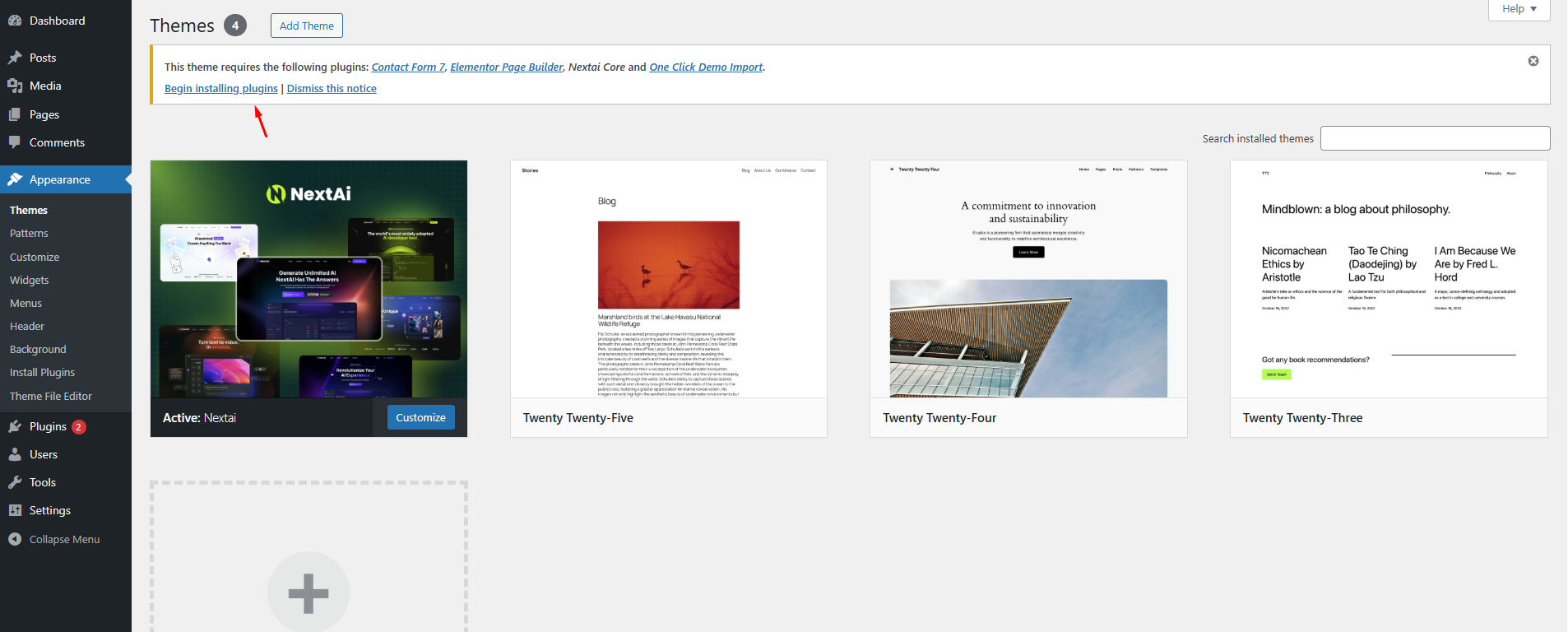 Install Themes button, then click Upload.Browse and locate the above mentioned nextai.zip, click