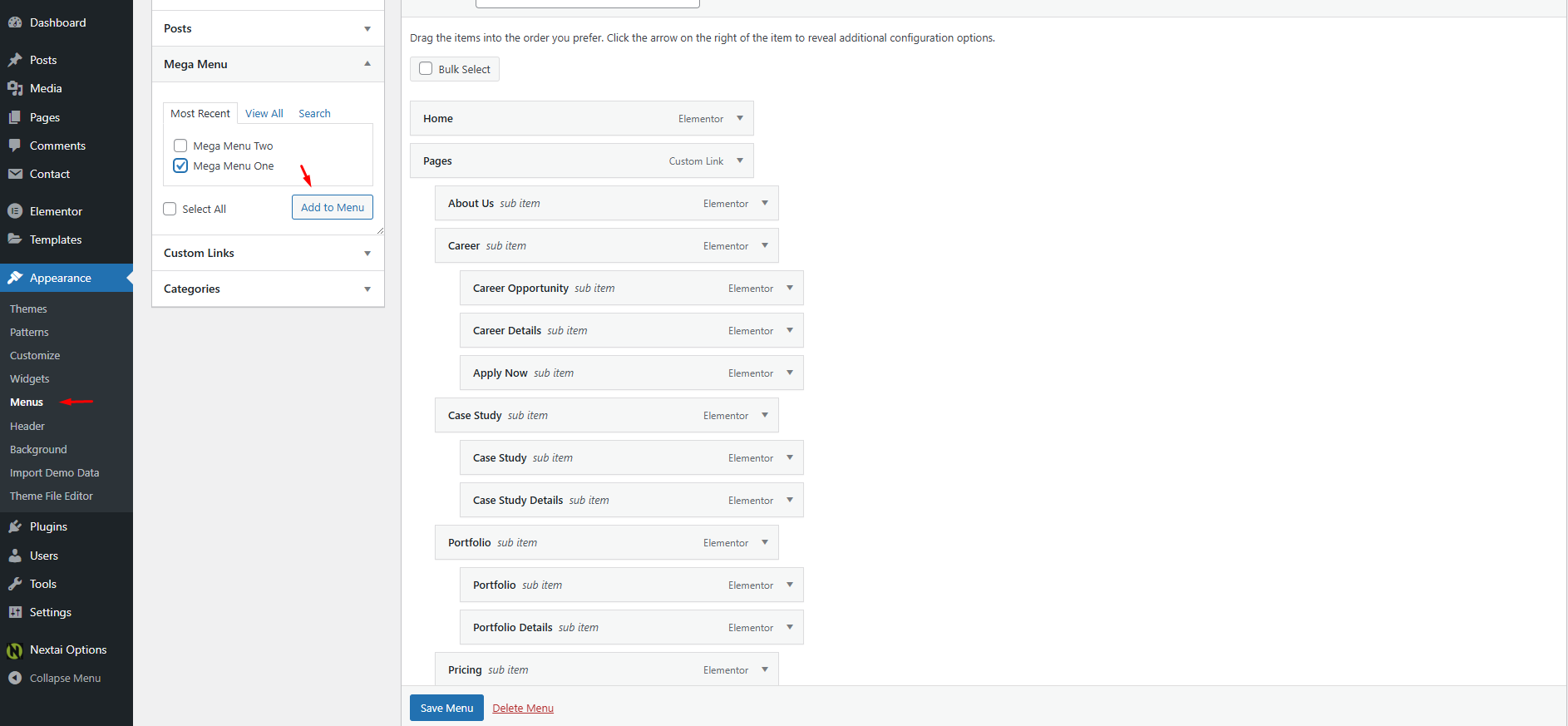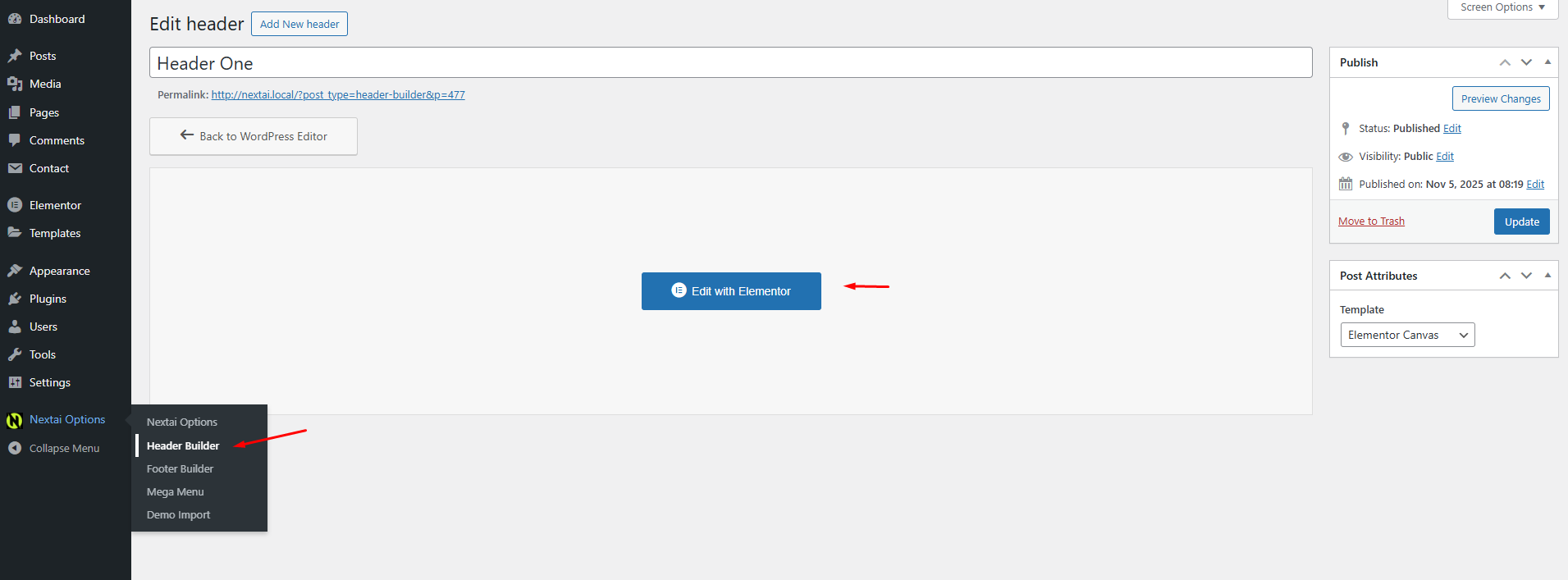 Nextai Has a awesome Header Builder to make your header with your own style. You can set unique header for each individual page. To Make header with elementor go to Nextai Options->Header Builder. Now Click Add New header Then click on Edit with Elementor. Now make your own header style.