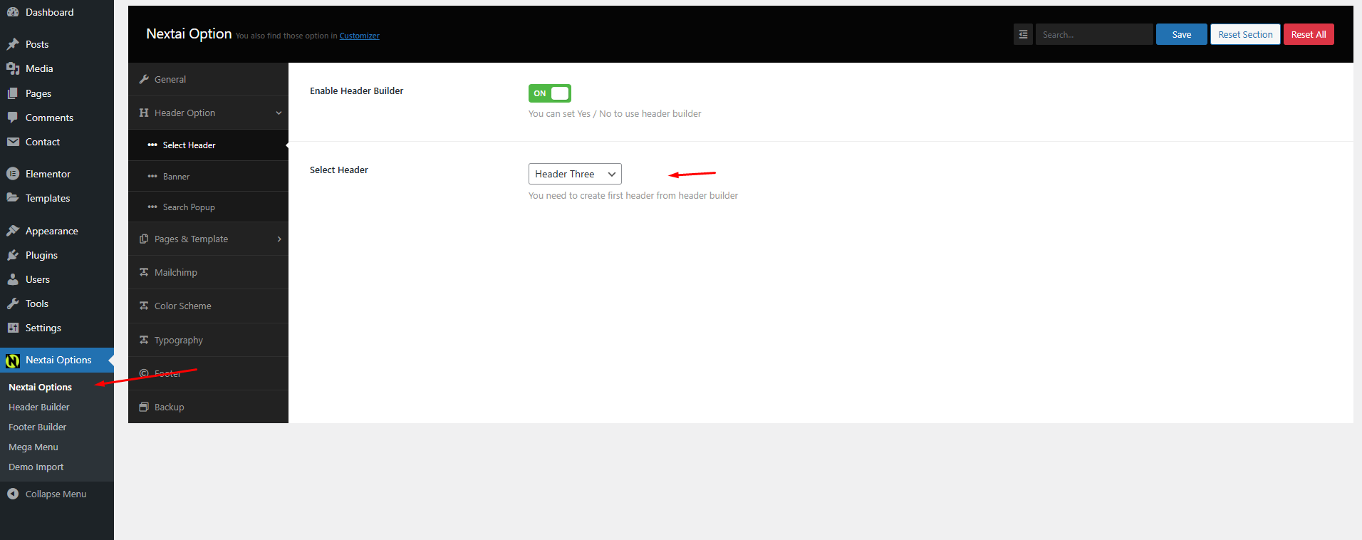 After making header go to Nextai Options->Header and Set Your Header Globally