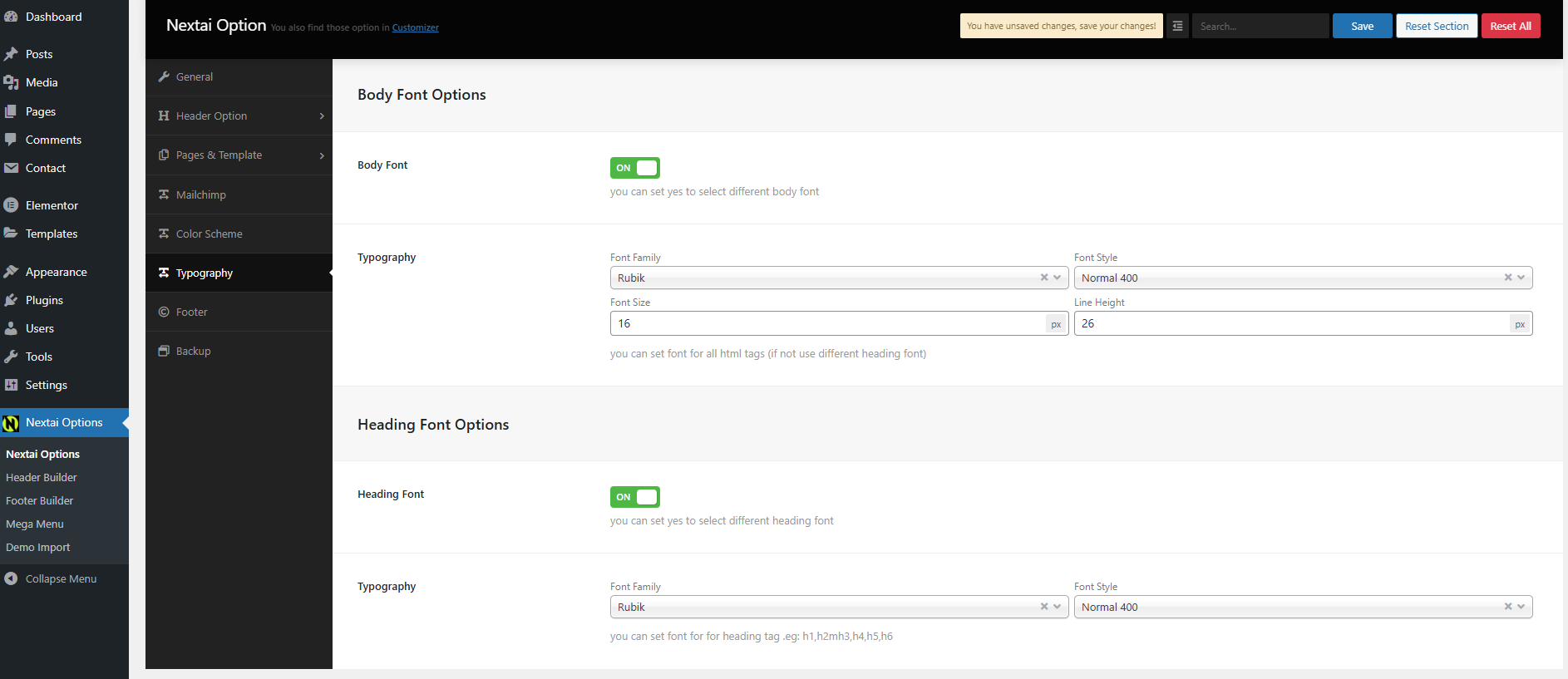 To change typography go to Nextai Options->Typography. You can change body and header typography from here globally